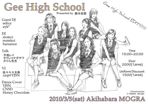またイベントやりますよ!今度は番外編!妄想私立Gee学園や! 制服女子や女教師やダンスカバーやアジア各国ポップス総ざらえでお送りします! 今一番マッドなアイドルポップスイベントに、君は、刻の涙を見る… あ、言い忘れたけど、出演者はみなさん制服か教…
